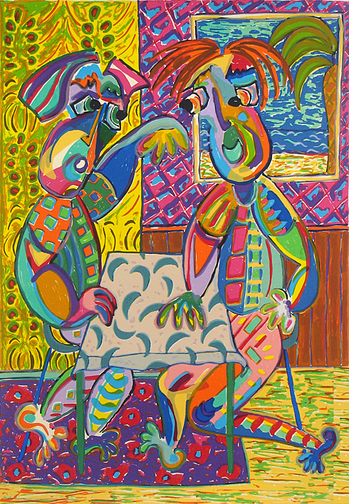 Zeefdruk Zonnebaden van Twan de Vos, Na een heerlijke duik in het zwembad genieten de zwemmers van een prachtige dag en zijn lekker aan het zonnenbaden, kunst, relatiegeschenk, kunstkado Zeefdrukken van Twan de Vos, een leuk kado of relatiegeschenk Zeefdruk Romantiek van Twan de Vos, verliefd stel heeft een romantische boottocht en voert de vissen, het kan in Venetie of Giethoorn zijn, zijn ze op huwelijksreis
