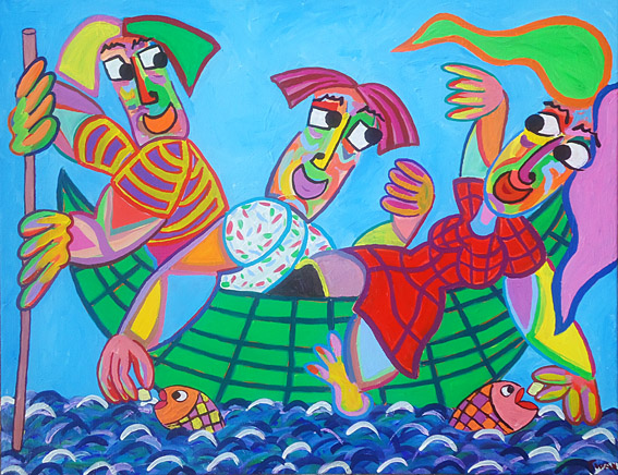 Schilderij Romantische boottocht van Twan de Vos, pas getrouwd stel, verliefd paar op  reis