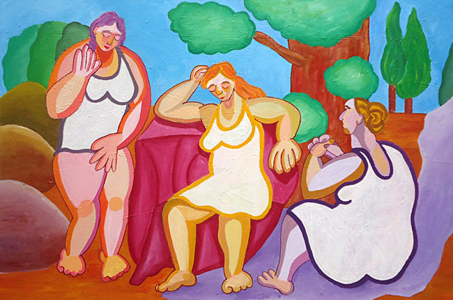 Schilderij De baadsters van Twan de Vos, 3 dames genieten na van een duik in het water, heerlijk gezwommen