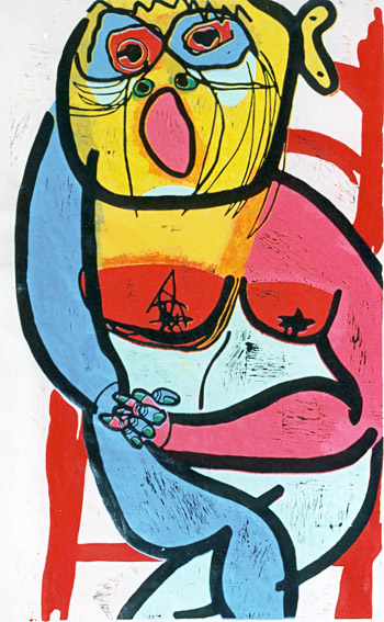 De linosnede Op het puntje van de stoel is te huur voor 5 Euro per maand.