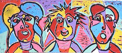 Linosnede Spiegelbeeld van Twan de Vos, mensen kijken in de spiegel, gedrukt volgens de methode Picasso